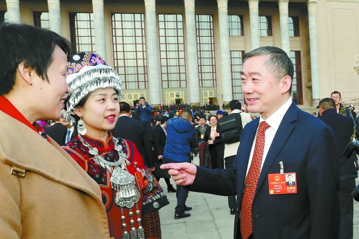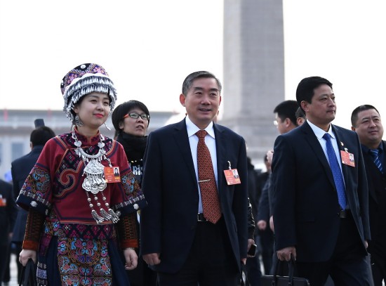 | 3月5日,第十三届全国人民代表大会第一次会议在北京人民大会堂隆重开幕。全国人大代表、省教育厅党组书记、厅长、省委教育工委书记蒋昌忠(中)等走向会场。 |