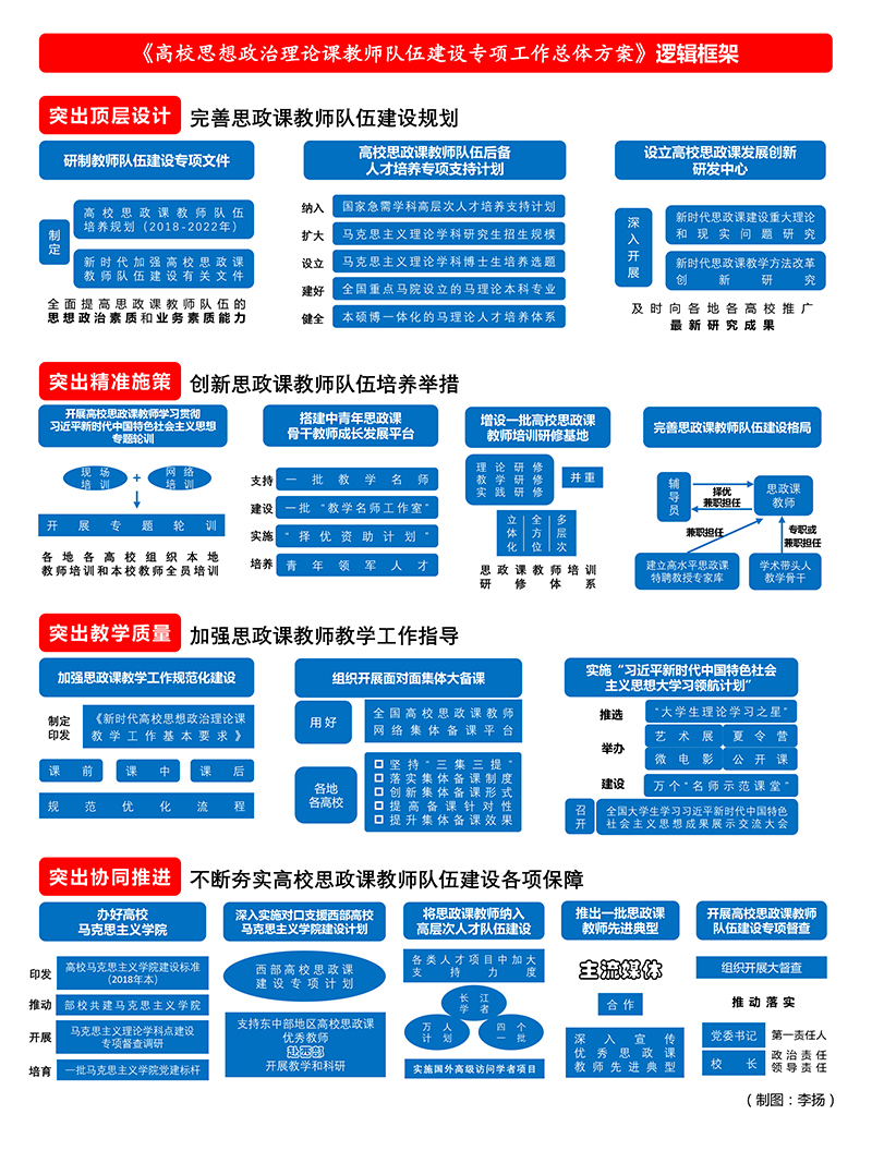 为全面推动习近平新时代中国特色社会主义思想进教材进课堂进学生头脑,聚焦提升思政课教师综合素质和专业化水平,继续打好提高高校思政课质量和水平的攻坚战,培养担当民族复兴大任的时代新人,教育部决定2018年实施高校思想政治理论课教师队伍建设专项工作,并于日前印发了工作总体方案。