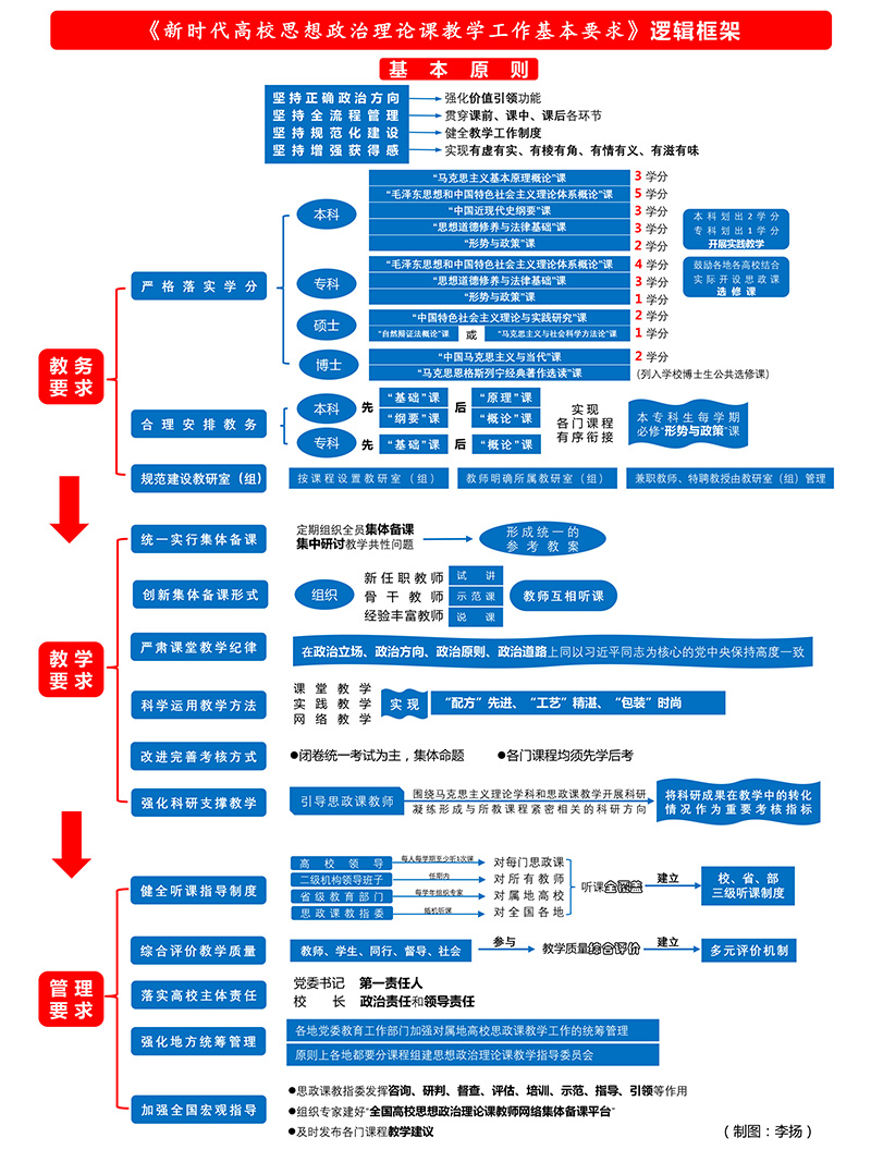 《基本要求》立足规范流程,抓住思政课教学课前、课中、课后等关键环节,在操作层面进一步明确工作要求。从严格落实学分、合理安排教务、规范建设教研室(组)、统一实行集体备课、创新集体备课形式、严肃课堂教学纪律、科学运用教学方法、改进完善考核方式、强化科研支撑教学、健全听课指导制度、综合评价教学质量、落实高校主体责任、强化地方统筹管理、加强全国宏观指导等十四个方面作了规定。