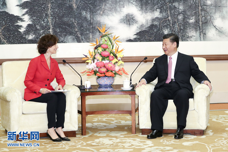 习近平欢迎阿祖莱总干事首次访华。习近平指出,当今世界,各国人民前途命运越来越紧密相联。人类文明是多元并存的。进入新时代的中国,我们一方面坚持文化自信,大力发展教育、科技、文化事业,提高文明素质,一方面秉持“世界大同”、和合共生的传统理念,主张各国文化相互尊重,交流互鉴。中国提出“一带一路”倡议,既要促进共同发展,也要促进民心相通。中国愿为促进世界文明对话和人类发展进步作出更大贡献。